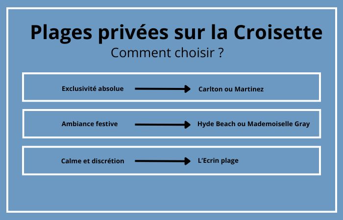 Plage du Martinez, Carlton Beach Club, Môme Plage, Ciro’s Cannes, Annex Beach, Miramar Plage.